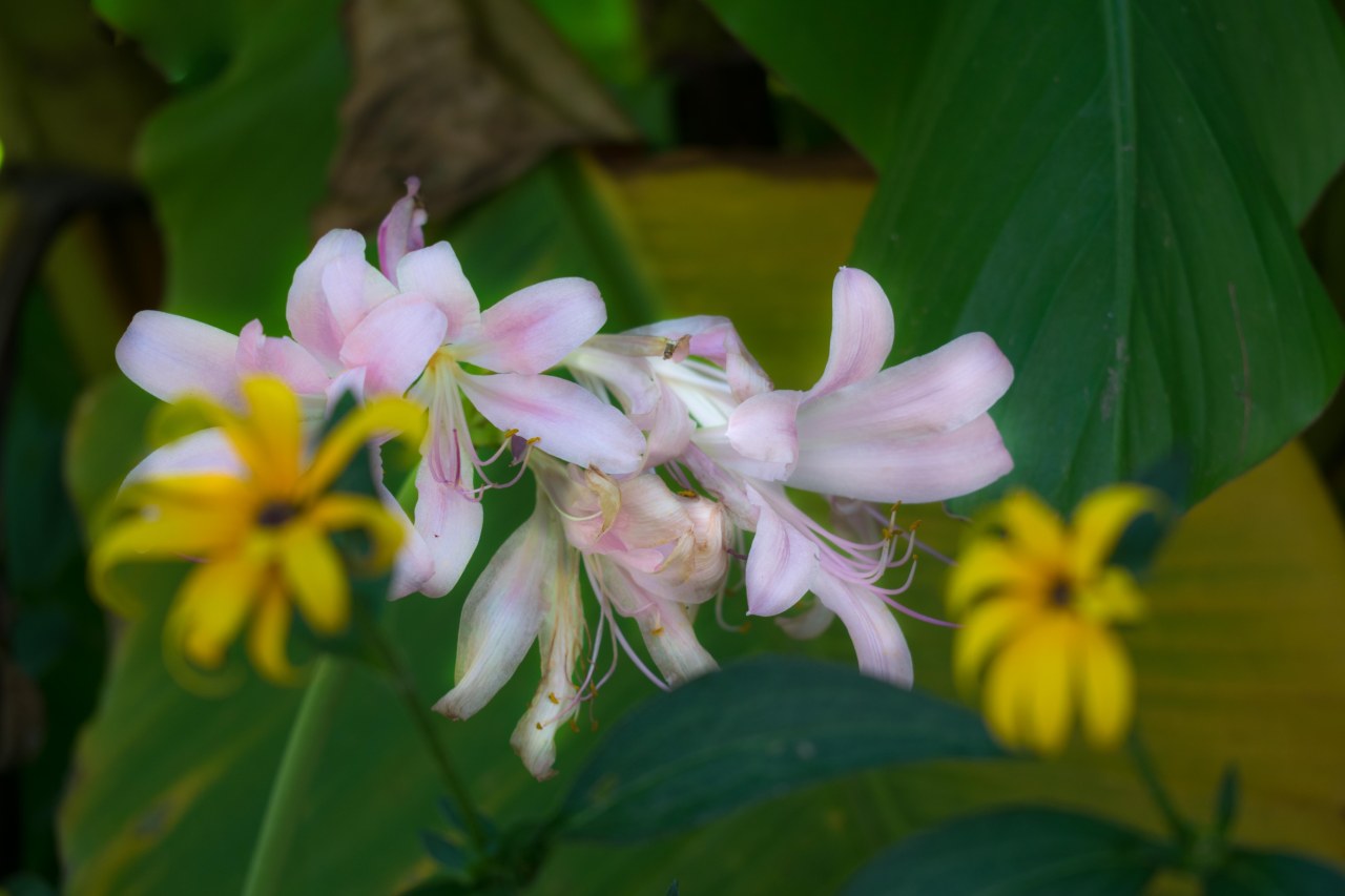 The light purples and whites of the lilies stick out against the green background. The picture also has a 3D feel with the Black Eyed Susans blurred in the foreground. Some of the browning and turning petals showing that even true beauty in nature has its imperfections.