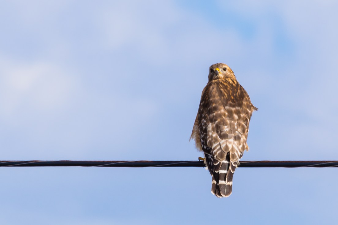 This day worked out well for me. This red-tailed hawk could care less that I had stopped on the side of the road to snap some pictures. He did give me the silent treatment keeping his back turned to me. At least he did take a glance over his shoulder so I could get a decent picture. Would it have been better in flight, yes would it have looked better as a front shot, yes and would it have looked better in a tree instead of on a power line, yes. Guess I still have some work to do.