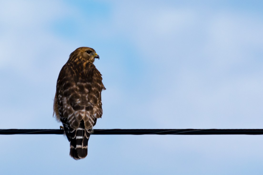 This day worked out well for me. This red-tailed hawk could care less that I had stopped on the side of the road to snap some pictures. He did give me the silent treatment keeping his back turned to me. At least he did take a glance over his shoulder so I could get a decent picture. Would it have been better in flight, yes would it have looked better as a front shot, yes and would it have looked better in a tree instead of on a power line, yes. Guess I still have some work to do.