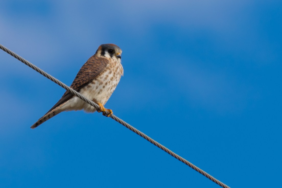 Then as a matter of feast or famine the picture taking feast ensued. This little Peregrine Falcon decided to sit still long enough to get a couple shots. As I crept too close he took off and landed just a few feet down the wire. Thus allowing me a couple more shots. Due to his smaller size it almost looked like something you could make a pet out of. Like a parakeet, that would rip your eyeballs out.