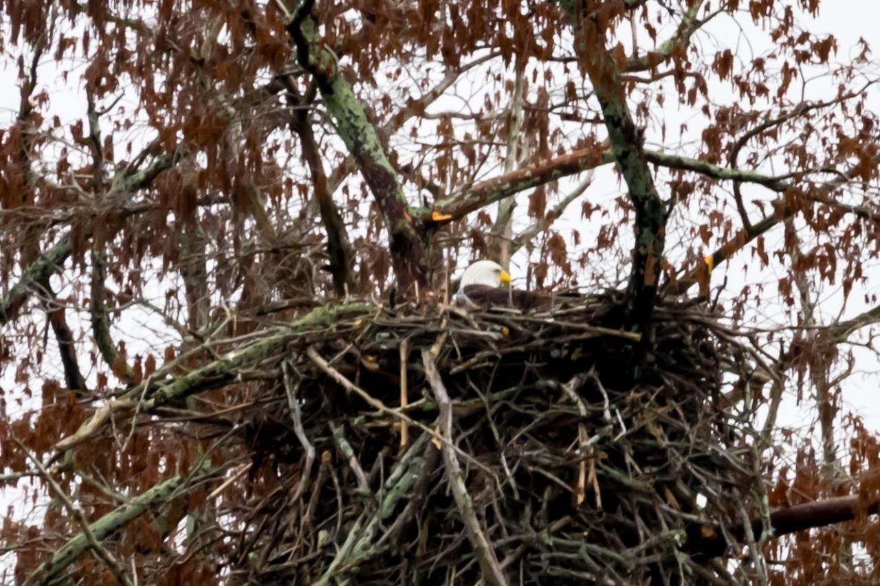 I took a ride out to a local lake and check out the eagles nest there to see if there was any activity going on. This is the, as zoomed in as I can get, uncropped image of the nest. I just wanted to take a shot for perspective. I couldn’t see anything in it in the field, just taking a picture of the nest. When I loaded it up on the computer and zoomed it in to full size what do I see but a little white head poking out. So I cropped, and cropped and cropped some more and got images, good enough for the web, of the eagle. Would I try to print these – no, would I submit them for a contest – no, would I even brag about them – probably not. But will I use them to show that you need to check your pictures close because you may have got something you didn’t know was there – you betcha