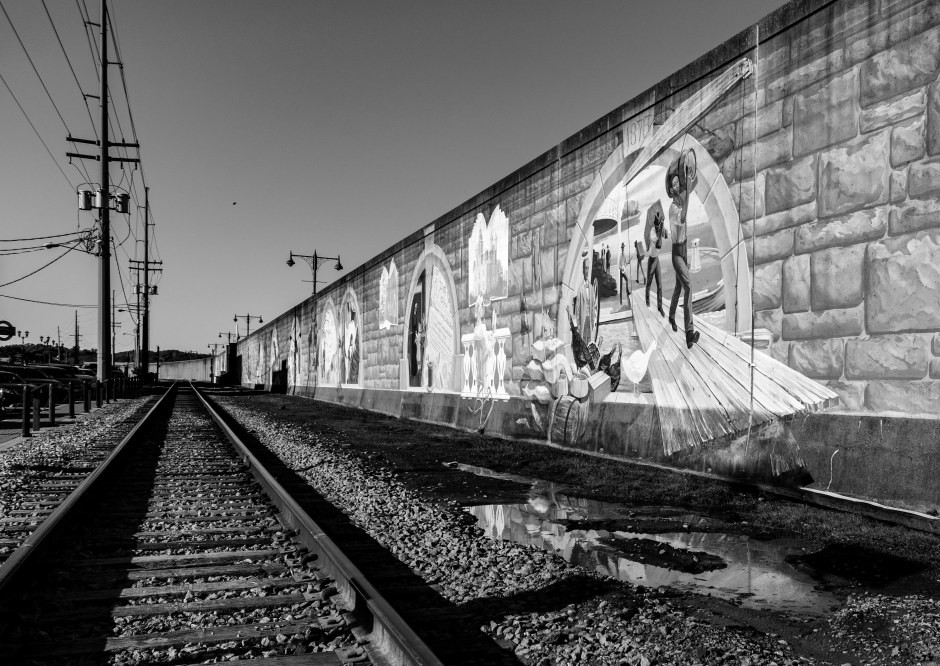 The murals of scenes from long ago are depicted on the outside of the flood walls. But the living scene still tells the story as evident of the railroad tracks right here next to the river. A place where the cargo of the country can go from waterway to railway. It just begged for a black and white photo to take you back in time a bit and realize how much hasn’t changed in some places.